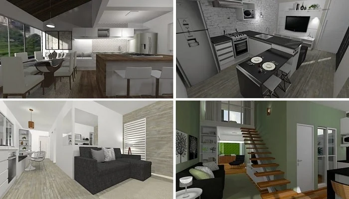 Em cozinhas e salas menores, soluções inteligentes como o uso de ilhas que servem também como mesa de jantar (como visto em um espaço de 3,70 x 3,25m) ou a disposição em “L” (em 4,7 x 4,5m) garantem funcionalidade sem comprometer o conforto. A sala de jantar, em alguns projetos, atua como um elemento divisório natural, separando sutilmente os ambientes, como no exemplo de 4,7 x 3,45m.