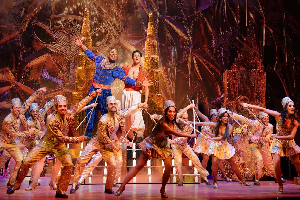 Adaptado do filme da Disney e inspirado em contos como “As Mil e Uma Noites”, o musical foi relançado em 2014 com uma produção ousada. A jornada leva o público a um mundo exótico de aventuras e romance. A trilha sonora conta com cinco canções vencedoras do Oscar, além de novas composições criadas especificamente para o palco. Mais de 40 atores se apresentam no New Amsterdam Theatre, em um cenário deslumbrante que custou milhões de dólares para imergir os espectadores na atmosfera mágica do show. A direção e coreografia são de Casey Nicholaw, com uma equipe talentosa de designers de iluminação, figurinistas e maquiadores.