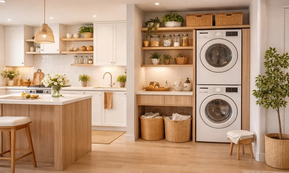 A lavanderia não precisa ser um espaço estritamente utilitário e sem graça. Para torná-la mais acolhedora, invista em iluminação indireta, que cria um ambiente suave e agradável, e considere a adição de plantas. Esses elementos não só melhoram o conforto visual e a sensação do espaço, mas também podem estender essa atmosfera agradável para a cozinha integrada.