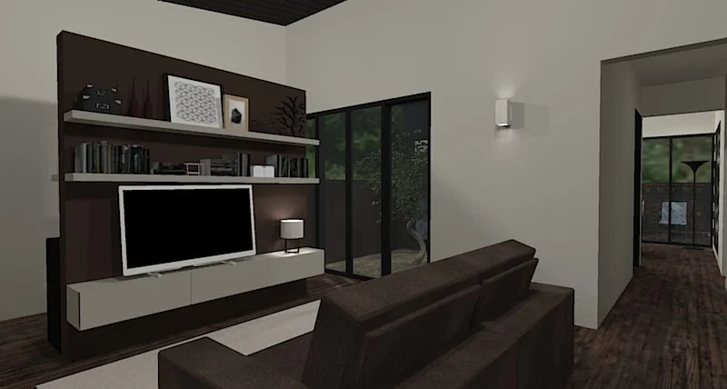 Imagine um espaço que une a praticidade de um escritório com o conforto de uma sala de estar, tudo isso emoldurado pela serenidade de um jardim interno. Este projeto de arquitetura transforma essa visão em realidade, priorizando a privacidade do home office sem sacrificar a conexão visual com a natureza. O jardim, posicionado estrategicamente no centro da casa, serve como um ponto focal, conectando visualmente a sala, o escritório e até mesmo a cozinha.